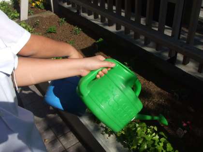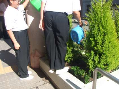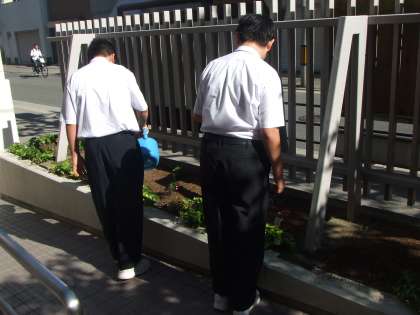 5月18日(木)2年生のボランティア部の生徒が放課後、玄関の花壇の花に水をあげてくれています。今日はいい天気で少し暑かったので花も喜んでいます。花も水分補給。ボランティア部のみなさん、ありがとう。