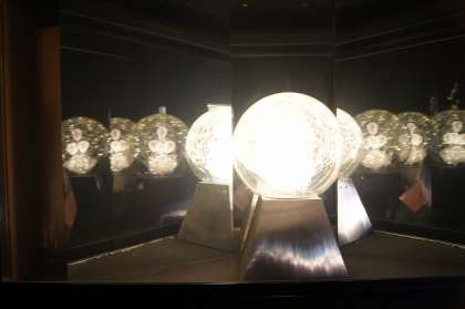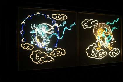 水引で作られた『風神・雷神』です。『光の玉』の造形です。部屋を暗くし、作品の裏側から光を当て、作品を浮かび上がらせています。