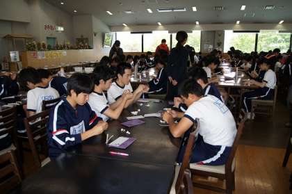 水引を使って、『お箸置き』を作っている生徒たちの様子です。みんな一生懸命作っています。5個作製し、一部は、民泊でお世話になる農家の方にお土産としてプレゼントしたそうです。