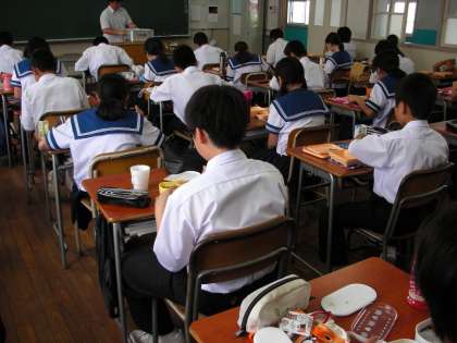 給食当番が配膳室前の給食を受け取り、各教室に給食を運びます。混乱しないように、一方通行にしています。生徒たちがこのルールをしっかりと守っています。
