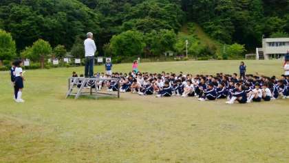 朝の集いのようすです。7時に芝生の広場に全員が集合し、朝の挨拶、生徒代表からのひとこと、先生からのひとこと等を行いました。