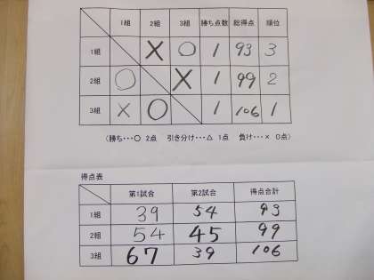 結果は、下の対戦表のように、3クラスとも1勝1敗で、得点差による順位が決定しました。