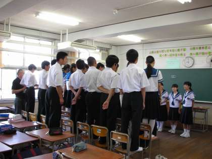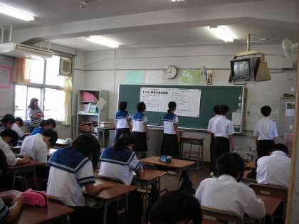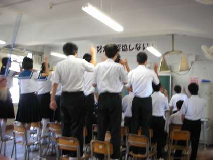 応援の形を作って練習しているクラス、リーダーが前に出て他の人は自席で応援歌を覚えているクラス等、様々な状況でした。