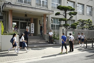 登校風景です。登校してくる生徒は全員体操服です。玄関には、普段とは異なり、PTA役員の皆さまもあいさつ運動をしてくださいました。