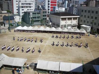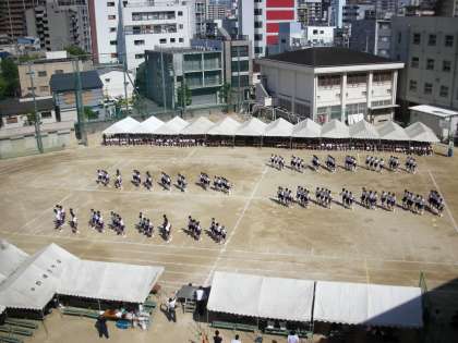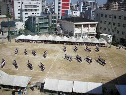 3年生の集団演技です。男子も女子も体育の時間に指導を受けて、練習してきました。短期間の練習ですが、3年生は心を込めて練習しました。写真は上から撮影したものです。