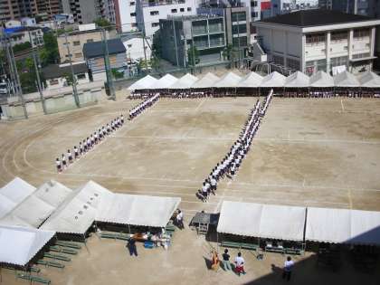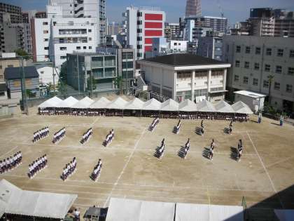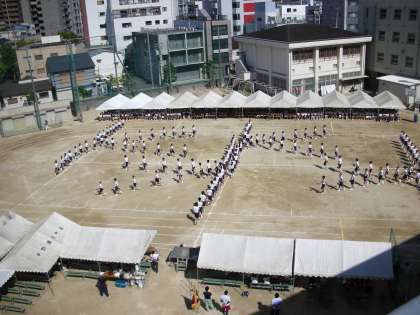 様々な形に隊形を変えていきます。本番では、テントが立てられており、少し距離感がずれた場面もありましたが、きれいに形ができています。