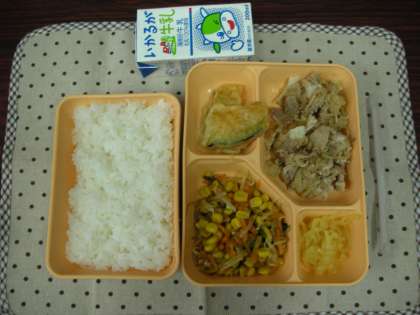 豚をご飯の上にのせて、豚丼にして食べます。今回もおかずが冷たいことで、豚肉の脂身が白くなり、「食べたい」という食欲がわかなくなってきます。残念です。お肉が冷やされると脂身の部分が大きな課題ですね。早くあったかい給食が食べたいものですね。