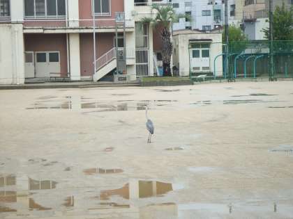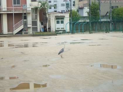 6月21日(水)朝からの雨も上がった昼前です。運動場にサギが来ました。最近あまり見かけなかったのですが、玄関の池の鯉・金魚を狙って2羽のカラスを伴い学校へ来ています。(写真には2羽のカラスは写っていません。)