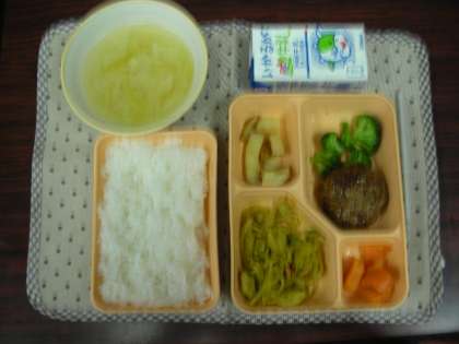 本日は、チーズインハンバーグ、ボイルブロッコリー、鶏肉と野菜のカレーソテー、フライドポテト、にんじんのグラッセ、スープです。