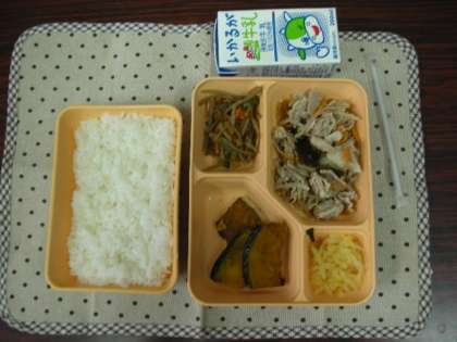 本日は、豚肉のごま酢かけ、かぼちゃのから揚げ、きんぴらごぼう、たくあんでした。
