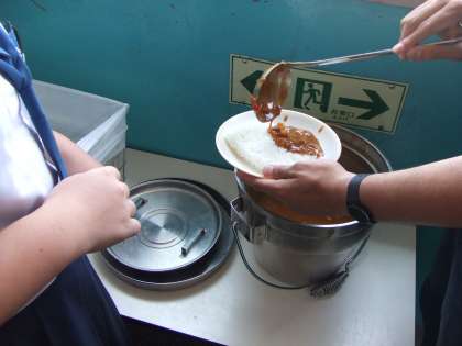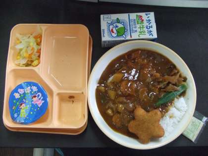 7月7日(金)夏野菜のコロッケカレー 星型コロッケにオクラを添え、福神漬けをのせておいしくいただきました。カレーにはジャガイモ、玉ねぎとなす、パプリカが入っていました。七夕ゼリーが付いていました。星型コロッケにオクラは切ると星形になります。また、開けると星空をイメージするようなゼリー。まさしく七夕メニューとしてはぴったり。辛さと夏野菜の甘みが出てコクとうまみのたっぷりの夏野菜カレー。ごちそうさまでした!!