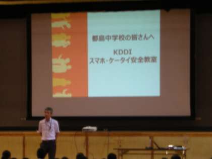 6時限目に体育館で『スマホ・ケータイ安全教室』を行いました。KDDIの専門家にお越しいただき、便利なはずのスマホや携帯電話が、「使い方を誤ると危険になることもある」というお話でした。実際に起きた事件をアニメにした映像を3本実写し、わかりやすい説明でした。