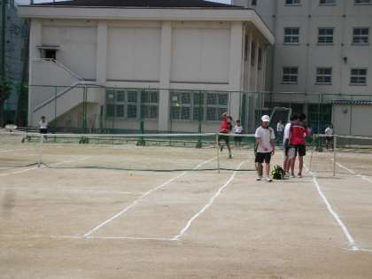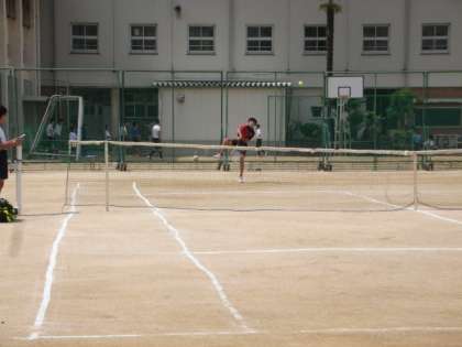 ダブルスとシングルスで試合が行われています。良いプレーができたときには、プレーヤーの大きな声が出ています。また、チームメートから大きな拍手がおきます。さわやかな声と拍手の音です。