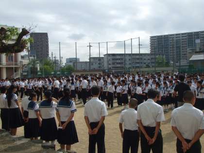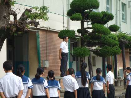 7月10日(月)昨夜の雨も上がり朝からセミが鳴き始め、真夏を思わせる暑さです。しかし、生徒たちは元気に登校し、ハンカチで汗を拭きながら全校集会に参加しました。各委員の代表から7,8月の目標が発表されました。