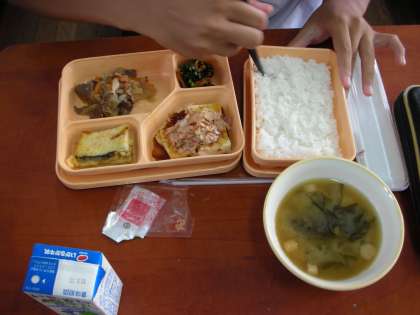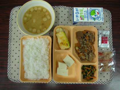 冷やっこの白色、カボチャの黄色、にんじんの赤色、小松菜の緑色と見た目が鮮やかな給食でした。