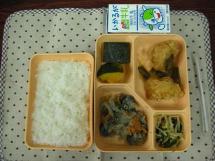 本日は、鶏肉のから揚げおろしボンズかけ、なすの味噌炒め、カボチャの煮物、小松菜ともやしのおひたしでした。