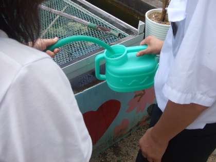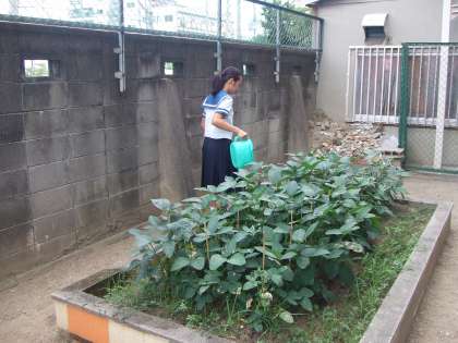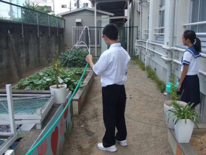 写真はボランティア部の人たちが西校舎裏の農園の作物に水を与えてくれています。この暑さ、芋や枝豆も喜んでいます。
