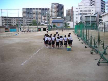 下級生が先生の周りに集まって、ミーティングを行っています。
