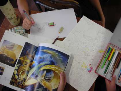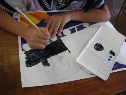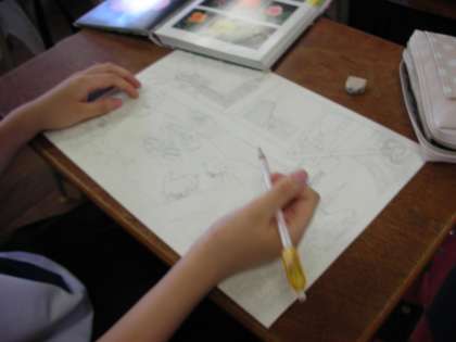 色鉛筆や水彩絵の具を使って、自分の作品を描いています。