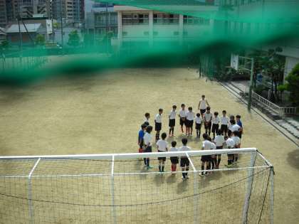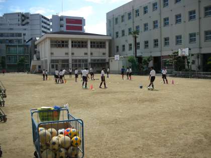 グラウンドでは、サッカー部が練習をしています。狭いスペースですが、ドリブル、パス、シュート、ヘディングと思いっきり動き回っています。