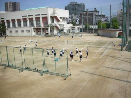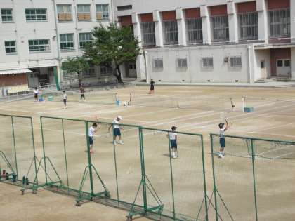テニス部は、硬式テニス部とソフトテニス部の2つあります。午前と午後の入れ替えで練習を行っています。今日の午前は、硬式テニス部の練習時間です。頑張っています。