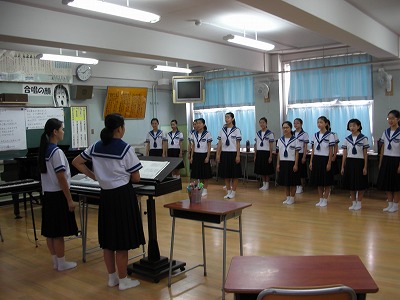 音楽部は、大阪市合唱祭に出場するため、相愛高等学校に出かけます。音楽室で、出発前の練習をしています。
