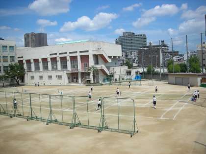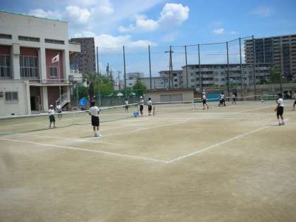 グラウンドでは、硬式テニス部が練習を行っています。みんな懸命にボールを追いかけ、相手コートに打ち返しています。みんながんばれ!