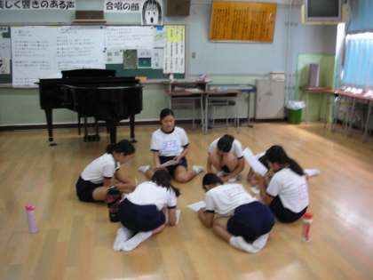 音楽部は、NHKコンクールに向けて、大詰めの練習を行っています。各パートに分かれて様々な取り組みを行っています。あるパートでは、原点に戻って歌詞の意味を全員が理解する打ち合わせをしています。また、別のパートでは、気持ちを込めて歌うことができているのか、点検しています。