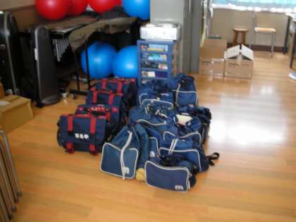 音楽室の準備室には、かばんが整頓されて置いてありました。