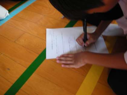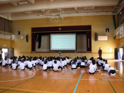 1年生は、体育館で画像を見ながら、自分のワークシートに考えをまとめています。真剣に考えをまとめています。