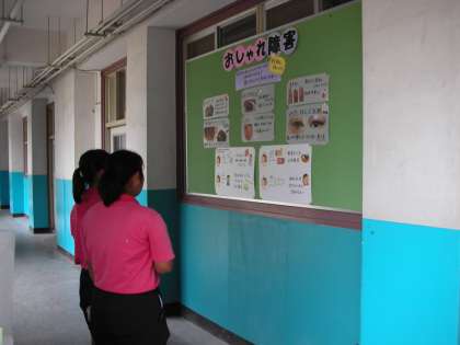 ソフトテニス部の生徒たちが、休憩時間に保健室の掲示板を見ています。「こわいな」と、お互いに気を付けなければならないことを話し合っています。何の掲示物かというと『おしゃれ障がい』について、まとめたものです。中学生もやがて様々なおしゃれをすると思いますが、そのやり方によっては自分自身の体を傷つけてしまうことがあるという事例が写真とともに示されています。詳しいことは、学校でご覧ください。