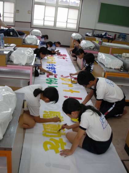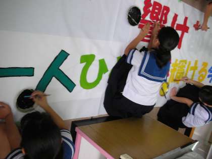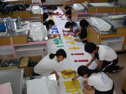 生徒会とハンドクラフト部の人たちが、六稜祭に向けた取り組みをしています。『横断幕』を作成しているのです。一文字一文字に色を付けて、インパクトが生まれるように、工夫が凝らされています。「2学期の大きな行事を成功させるぞ!」という、意気込みが感じられます。