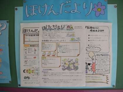 保健室前に保健便りが掲示されています。色鉛筆できれいに彩色し、読みやすくなっています。
