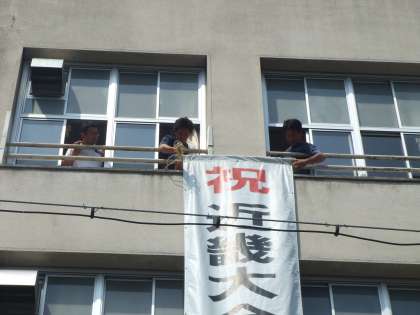 午後から、正門玄関の上の壁面に、『祝 近畿大会出場 音楽部(合唱)』と書かれた垂れ幕を設置しました。管理作業員さんが2人で協力しながら、設置してくださいました。「生徒の頑張りを支えたい」という思いで設置してくれたそうです。生徒たちは、多くの方々に支えられて、活動しているのです。音楽部の皆さん、次の関西大会での活躍を期待しています。