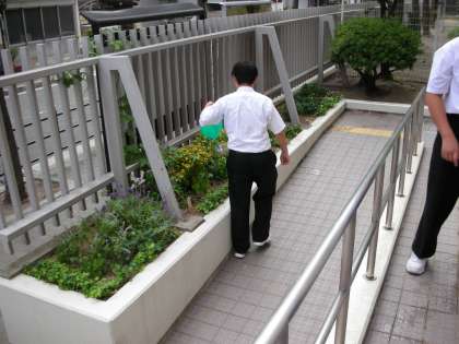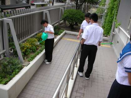 ボランティアクラブの皆さんが、花壇に水をまいています。様々な花がうれしどうにしています。