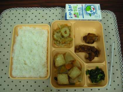 鶏肉の竜田揚げは、カラッと揚がっていて歯ごたえも良く、おいしくいただきました。その他のおかずも良い味付けで良かったと思います。生徒たちは、煮物やおひたしが概して好きではないので、実際に意見を聞いてみたいと思います。