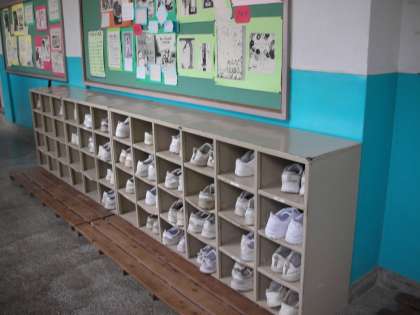 お昼休みの図書館の開館の様子です。下駄箱に靴がきれいに並んでいます。