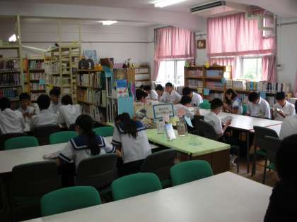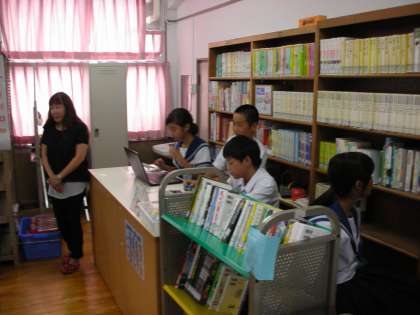 図書委員の人が図書の貸し出しを行っています。館内の生徒は、自分が読みたい本を集中して読んでいます。