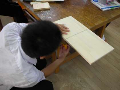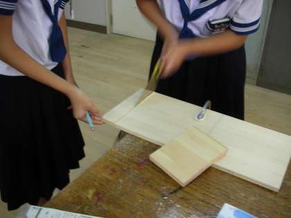 1年生は、技術室で実習を行っています。テーマは『箱作り』です。先生からノコギリの使い方、うまく切る方法等を指導してもらい、積極的に取り組んでいます。