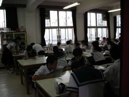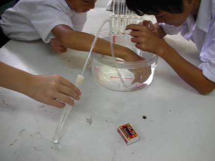 1年生は、理科の実験を行っています。みんな興味津々です。本当に期待通りに気体が集まるのか、目を輝かせて観察しています。写真は、水素を水上置換法で集めているところです。
