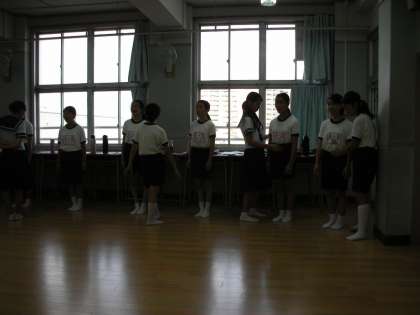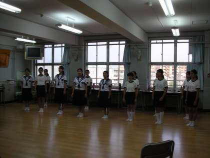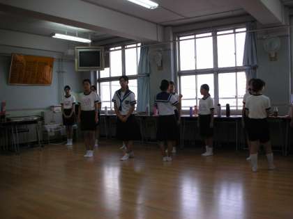 学年別に、パート別に練習を行っています。1年生は入部当初より、かなり上達してきました。大きな大会(9月23日に関西合唱連盟主催の関西大会)に出場するに当たり、「おなかから声を出すように」と、上級生が腹筋を押しながら説明しています。少しずつ発声の技術を学び、進歩していきます。