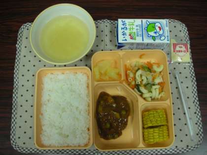 本日は、煮込みハンバーグ、マカロニサラダ、ゆでとうもろこし、パインアップル缶詰、大根のスープで、マヨネーズが添えられていました。