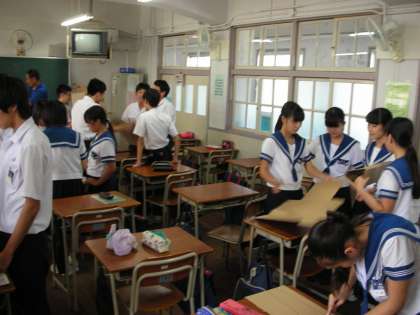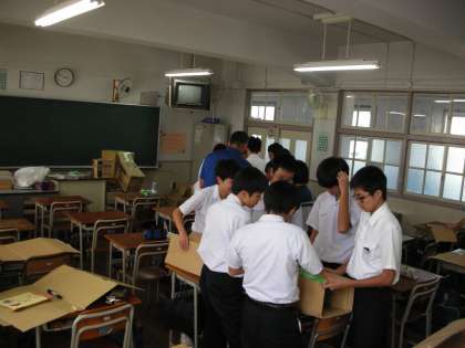 大道具部門の様子です。段ボールをたくさん集めて、はさみやカッターを利用して、裁断が始まっています。さて、何ができるのでしょうか。