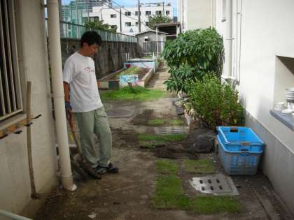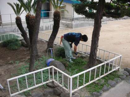 管理作業員さんが、様々な場面で環境整備にあったっています。芝生を校舎の裏に移植したり、植え込みの剪定している写真です。日々、学校の教育環境が少しでも良くなるように、取り組んでいます。