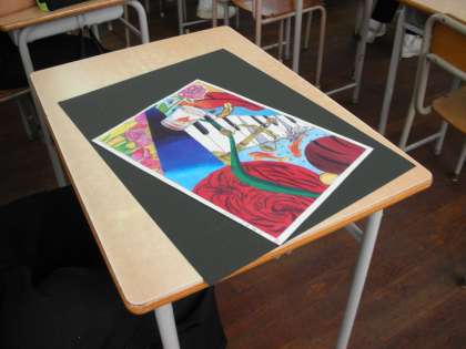 さて、生徒たちは、六稜祭(文化祭)に出品する自分の作品を黒い画用紙に貼り付けるという作業を行っています。黒い画用紙が立派な額縁の役目を果たしています。