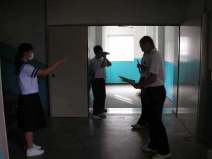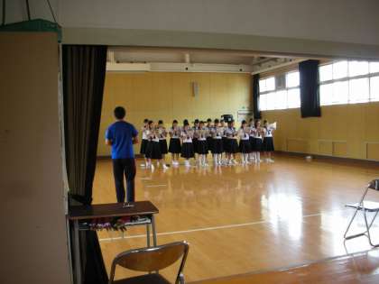 格技室や階段の踊り場で、歌の練習と踊りの練習をしています。その様子を撮影している人もいます。