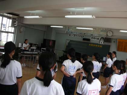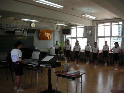 音楽部は、音楽室で練習をしています。本日、区民センターで行われる『中野地区敬老会』で、お祝いの歌をご披露するための練習です。心を込めて練習に励んでいます。
