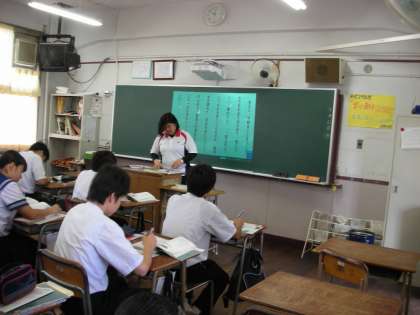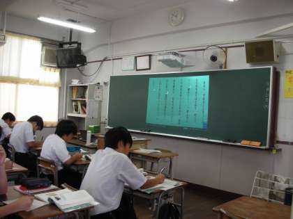 パソコンの教材をプロジェクターで黒板に映しだしています。このようにすると生徒の目が前に向き、しかも質問されたことを黒板に直に書くことができるので、わかりやすいと好評です。