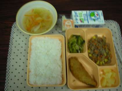 彩が良い給食でした。ミートピラフは、にんじんの赤色、牛肉の茶色、パインアップルの黄色、チンゲンサイの緑色と、目で楽しむことができる料理でした。