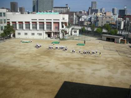 校舎から見た体育の授業です。男子体育は、陸上競技の中の走り高跳びを行っています。生徒たちは、自分にとってふさわしい飛び方を研究しています。